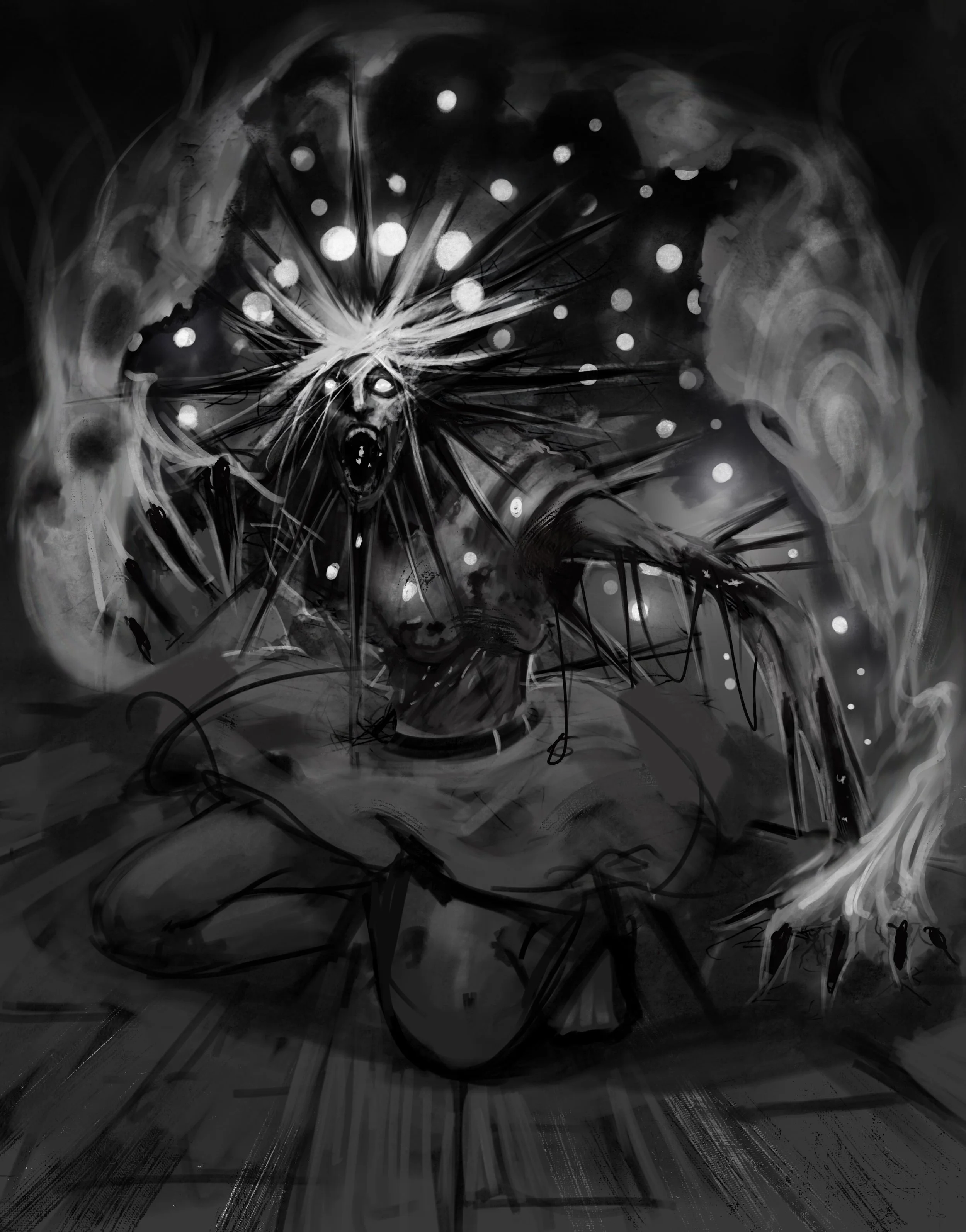 Aviva, or her body at least, was stretched so thin her muscles ripped and became exposed. Her organs, particularly those kept within her rib cage, leaked bile, pus, and dark blood onto the hardwood floors. Jagged black spikes emerged from dozens of points on her body. Her eyes glowed yellow. Her jaw unhinged like the broken skull of a snake mid Cronenberg fellatio. The gnashing of the hundred ivory daggers that were her teeth caused fresh blood to cascade everywhere she turned.